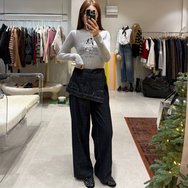 J1275 疊層設計高腰牛仔闊腿褲