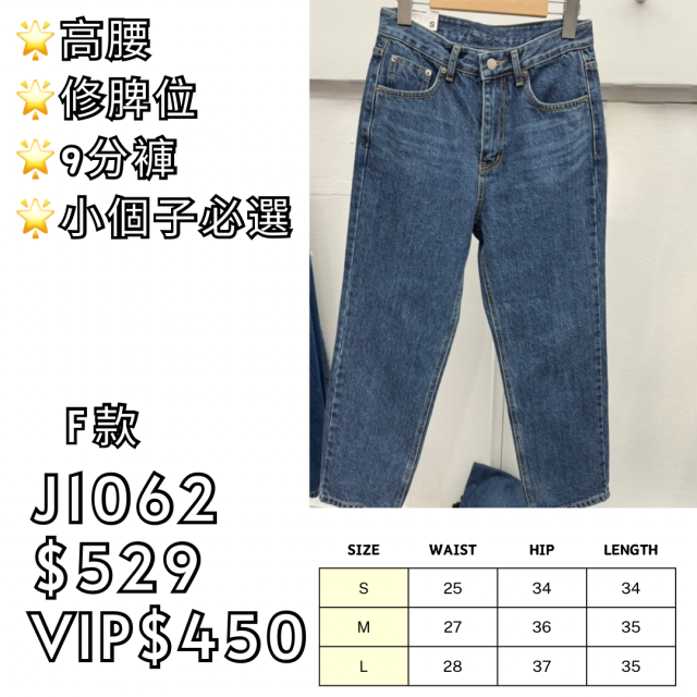 (F款) J1062 高腰修脾9分牛仔褲