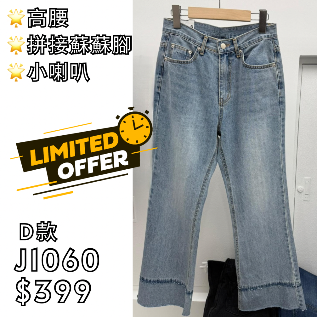 (D款) J1060 高腰拼接蘇蘇腳小喇叭牛仔褲