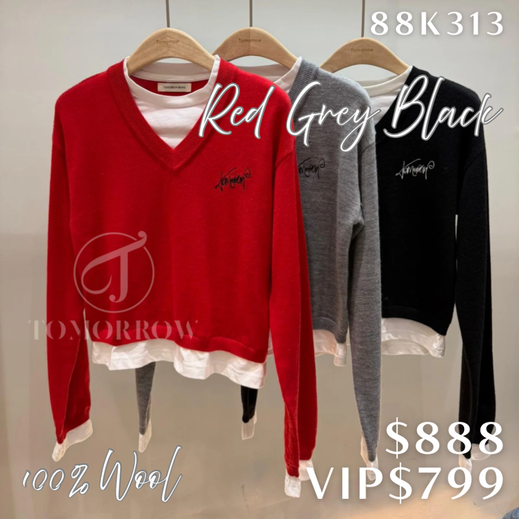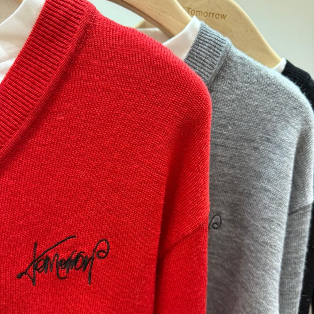 經典V領+假兩件設計,紅/灰/黑三色任你揀,實搭度滿分💯內層白Tee嘅下擺同袖口露邊細節,唔會過份沉悶,細節感滿滿😍😍仲有手寫刺繡字母添返份隨性feel。