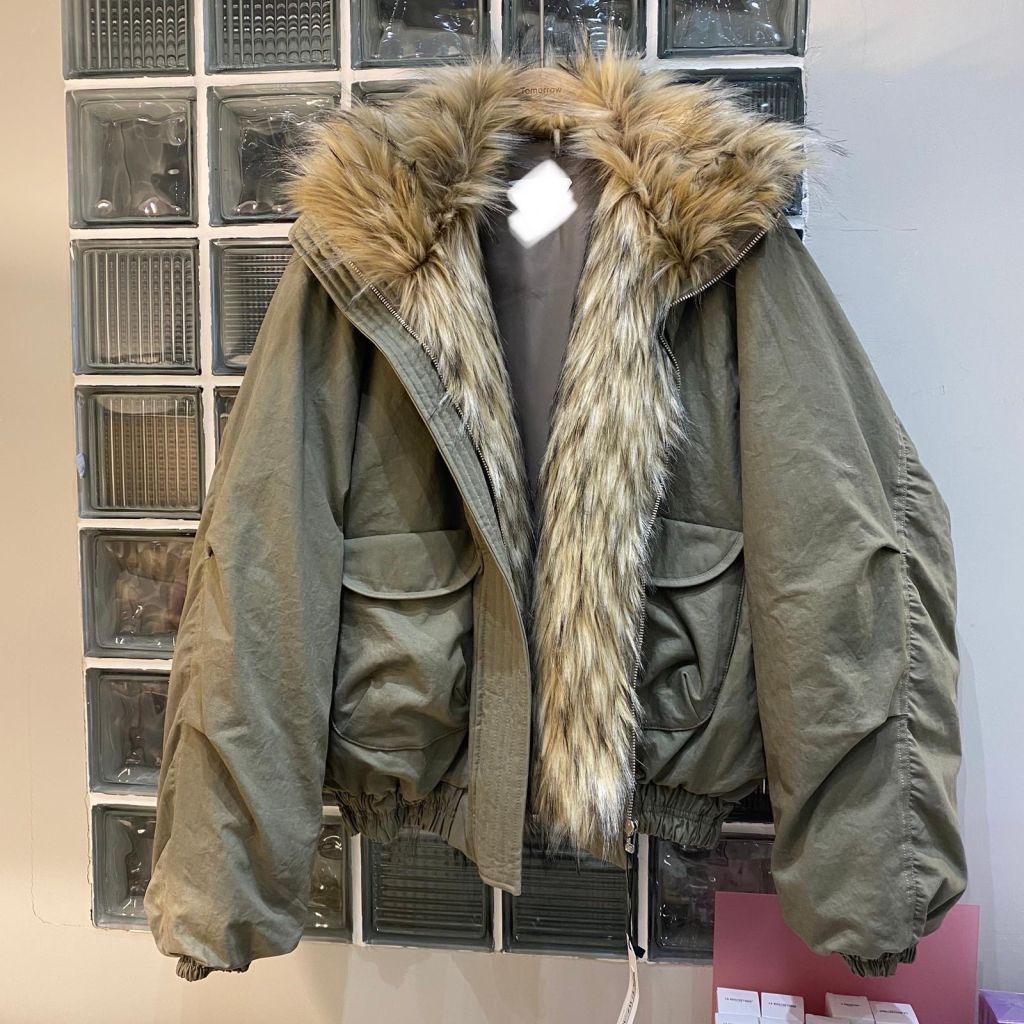呢件連毛領軍綠飛行外套走 oversize 路線,肩位微墜、袖身夠鬆,入面襯 hoodie 或粗冷毛衣都唔覺迫❄️