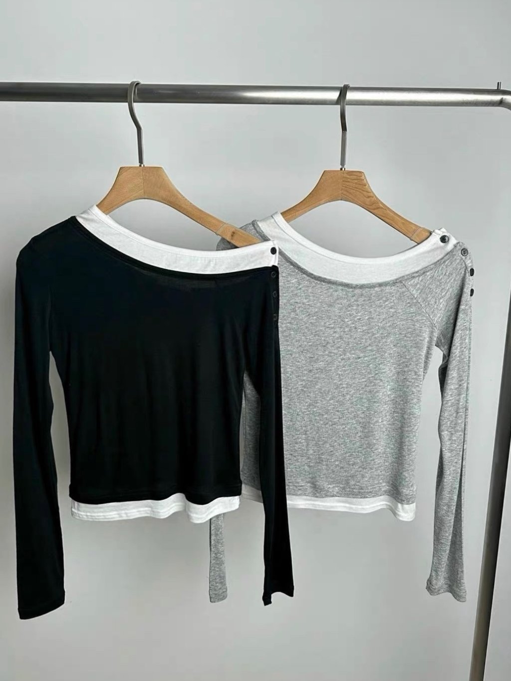 位做撞色加鈕扣細節,可以微微落肩露鎖骨,灰黑兩色都好易襯,下身配高腰 JEANS 或 SKIRT 就好靚!