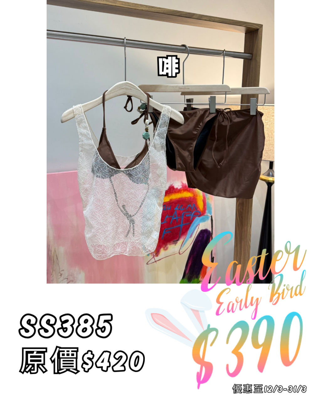 削肩比基尼配同色裙褲,再加一件白色蕾絲罩衫,上下呼應好有層次,行沙灘、去渡假酒店都好有造型感!
