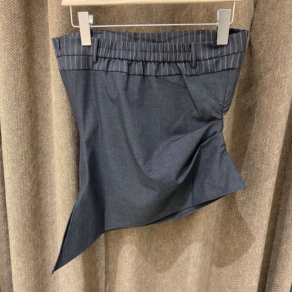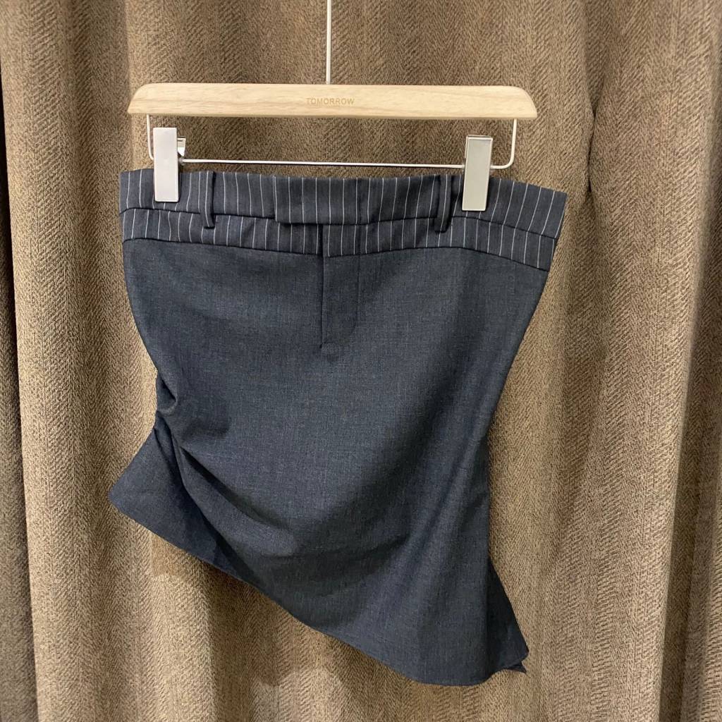 灰色西裝布配直間腰位拼接,造出不規則斜身剪裁,一字肩設計露出鎖骨同肩頸線條,好適合配高腰牛仔褲或西裝褲做型格 OL 造型。