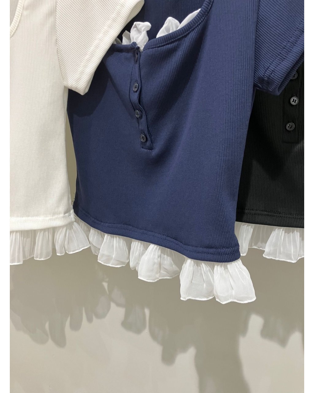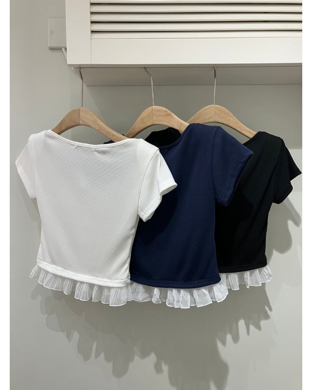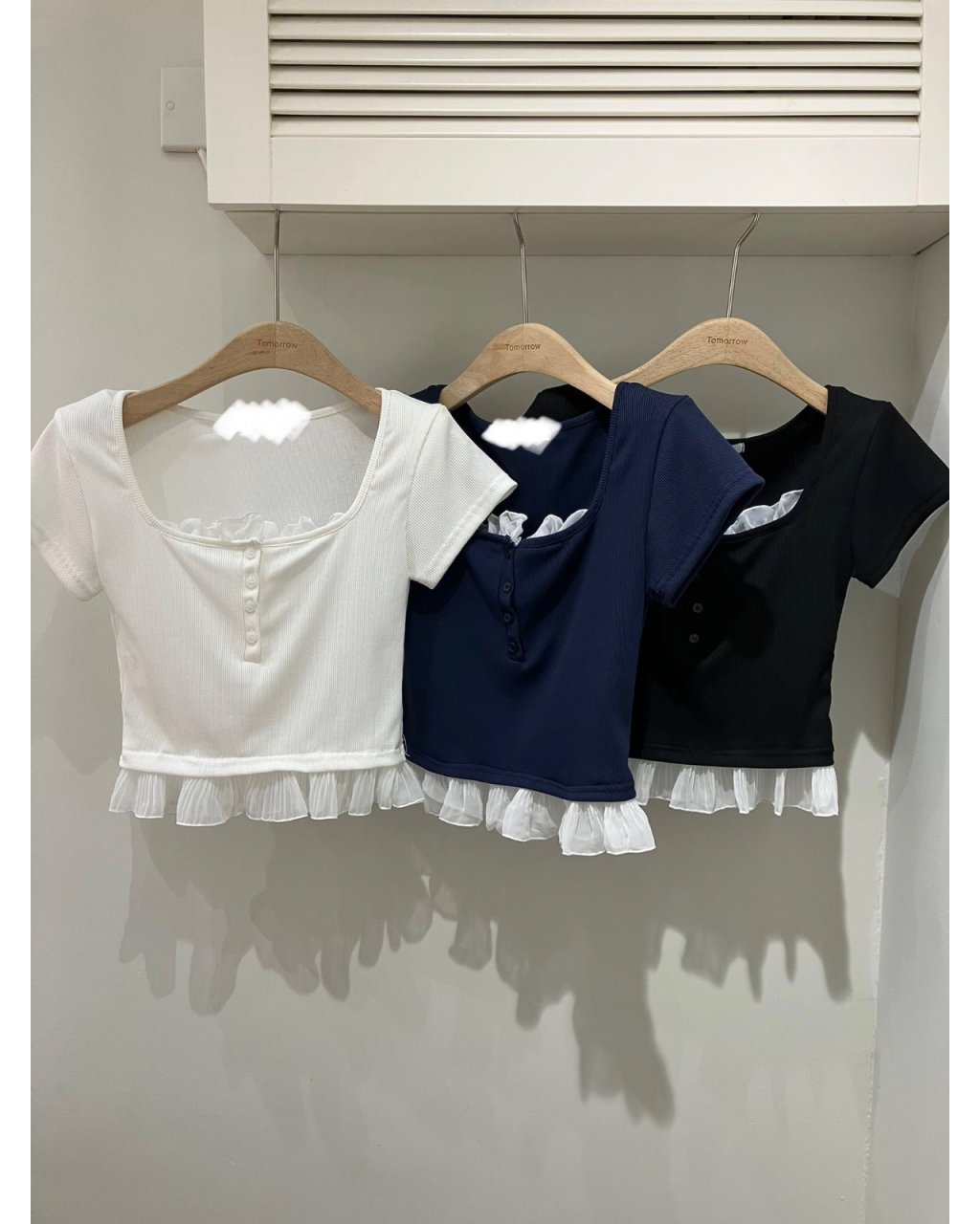 微彈坑紋棉質,方領配門襟鈕扣同下襬雪紡荷葉邊,短身剪裁拉長比例,白、深藍、黑三色易襯高腰下身。