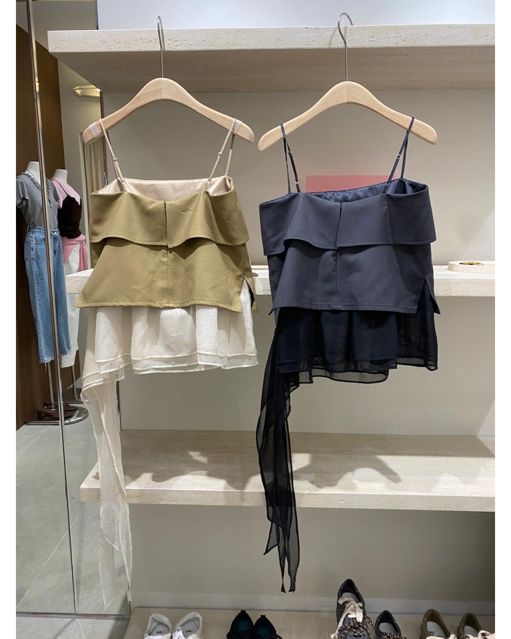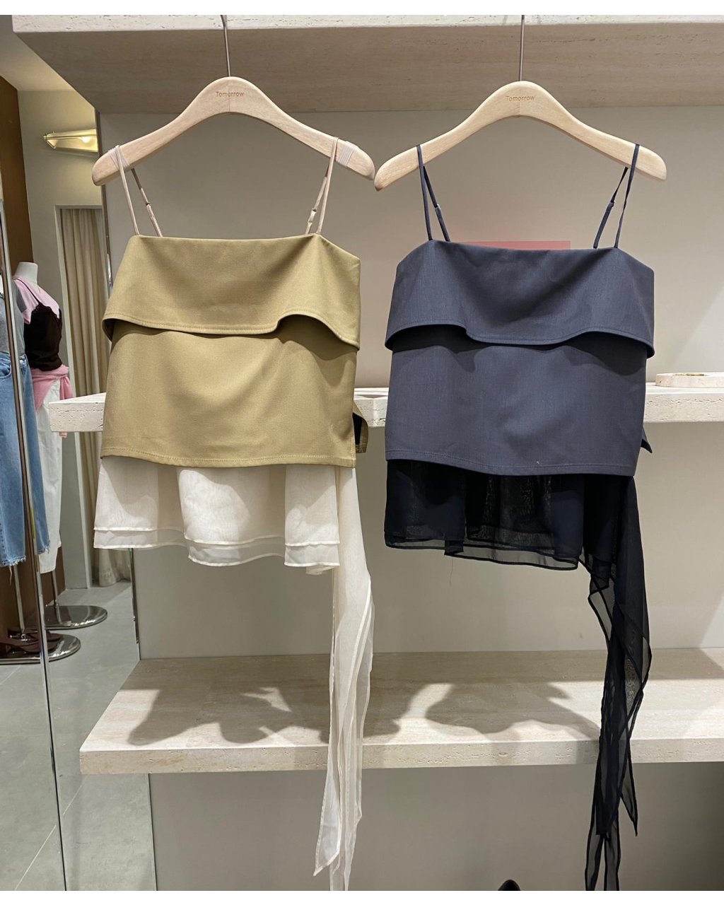 兩層挺身布配不規則雪紡下襬,行路有飄逸感,杏色溫柔、灰色型格,單穿或內搭貼身 Tee 都好顯瘦。