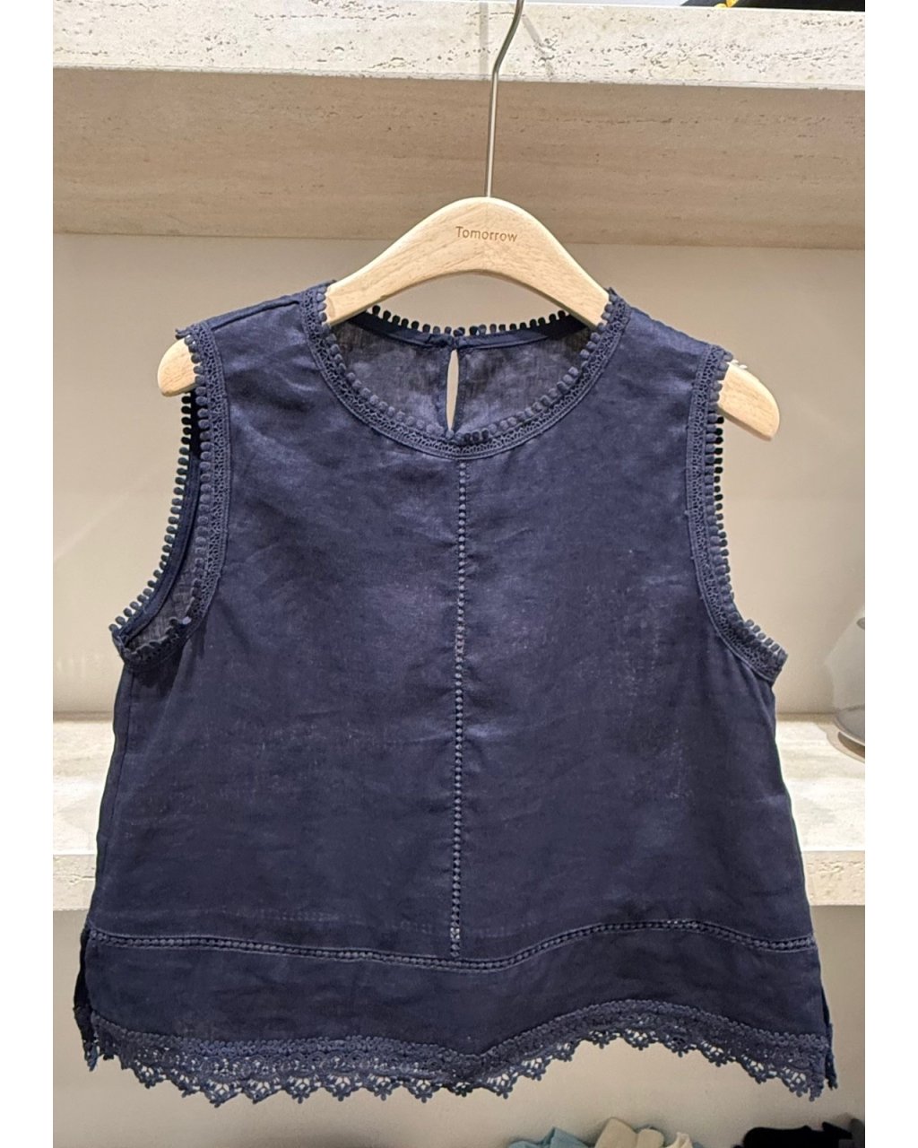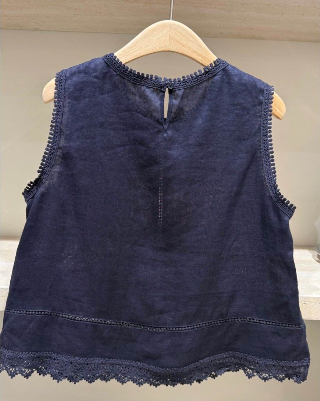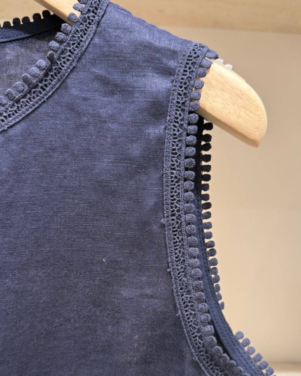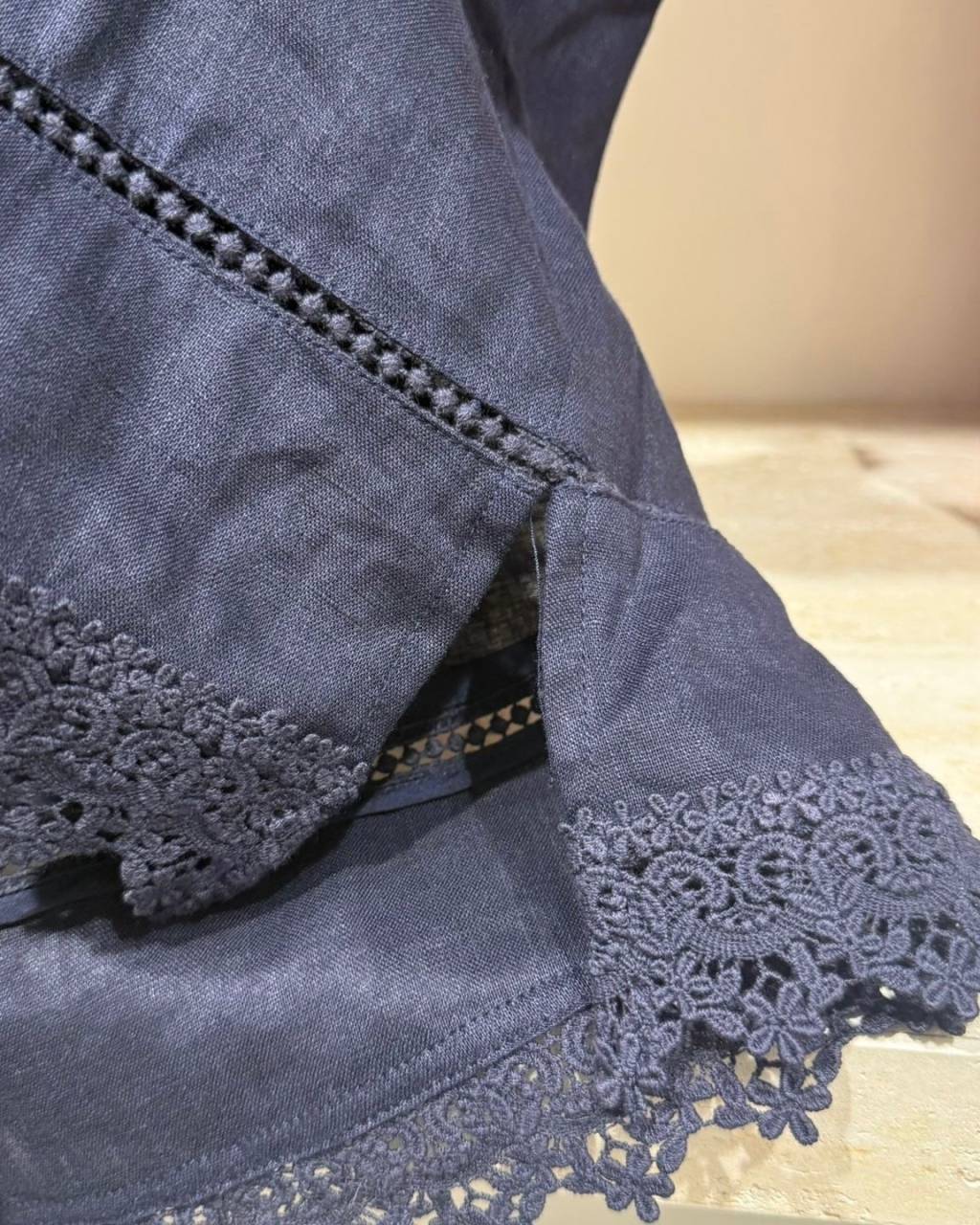 帶自然紋理感嘅亞麻布料,透氣涼爽好啱夏天着。領口同袖位繞一圈小波波邊,下擺拼細緻喱士,簡單襯牛仔褲或半身裙已經好有度假氣氛;深藍色穩重易襯,米白色就清新溫柔。