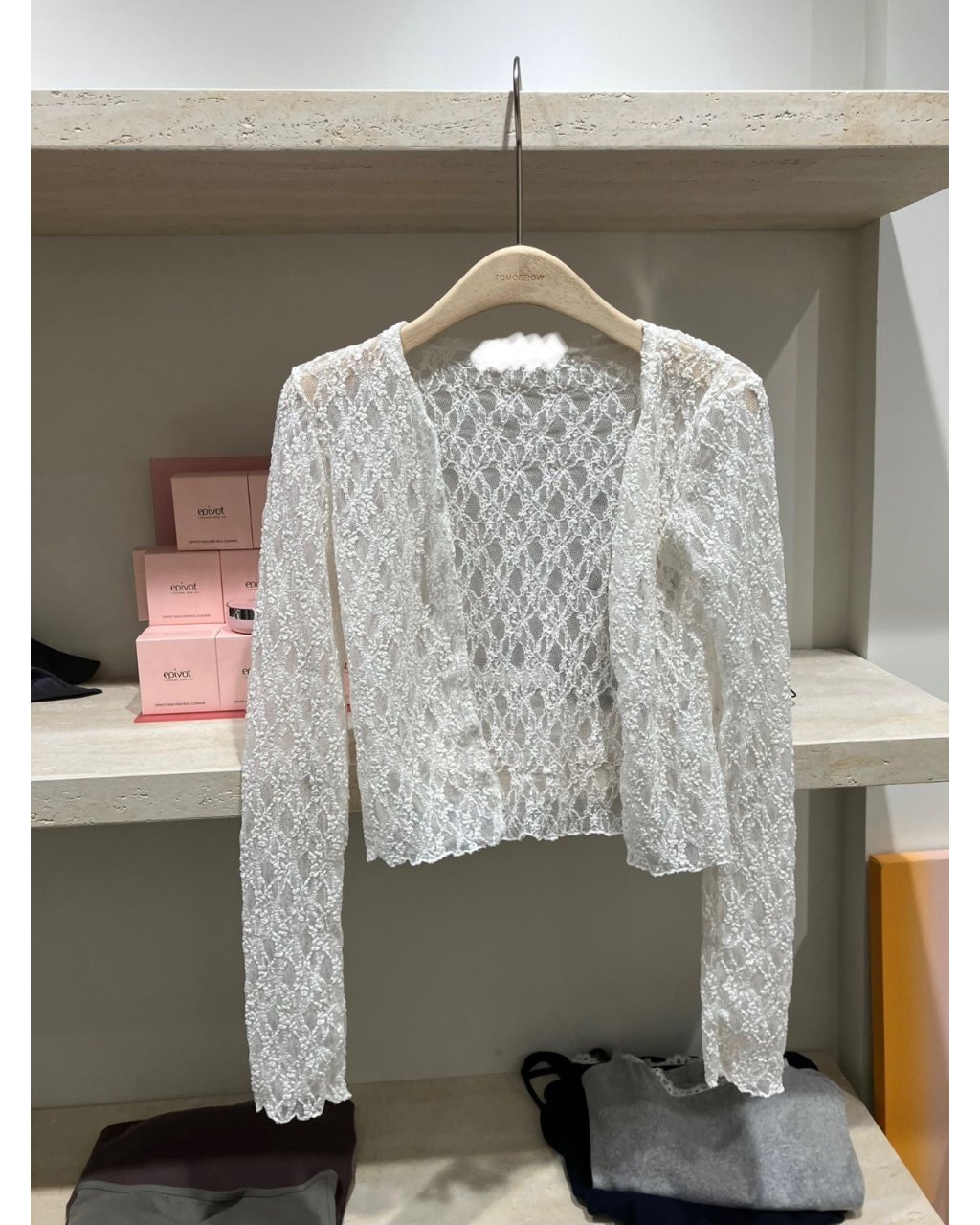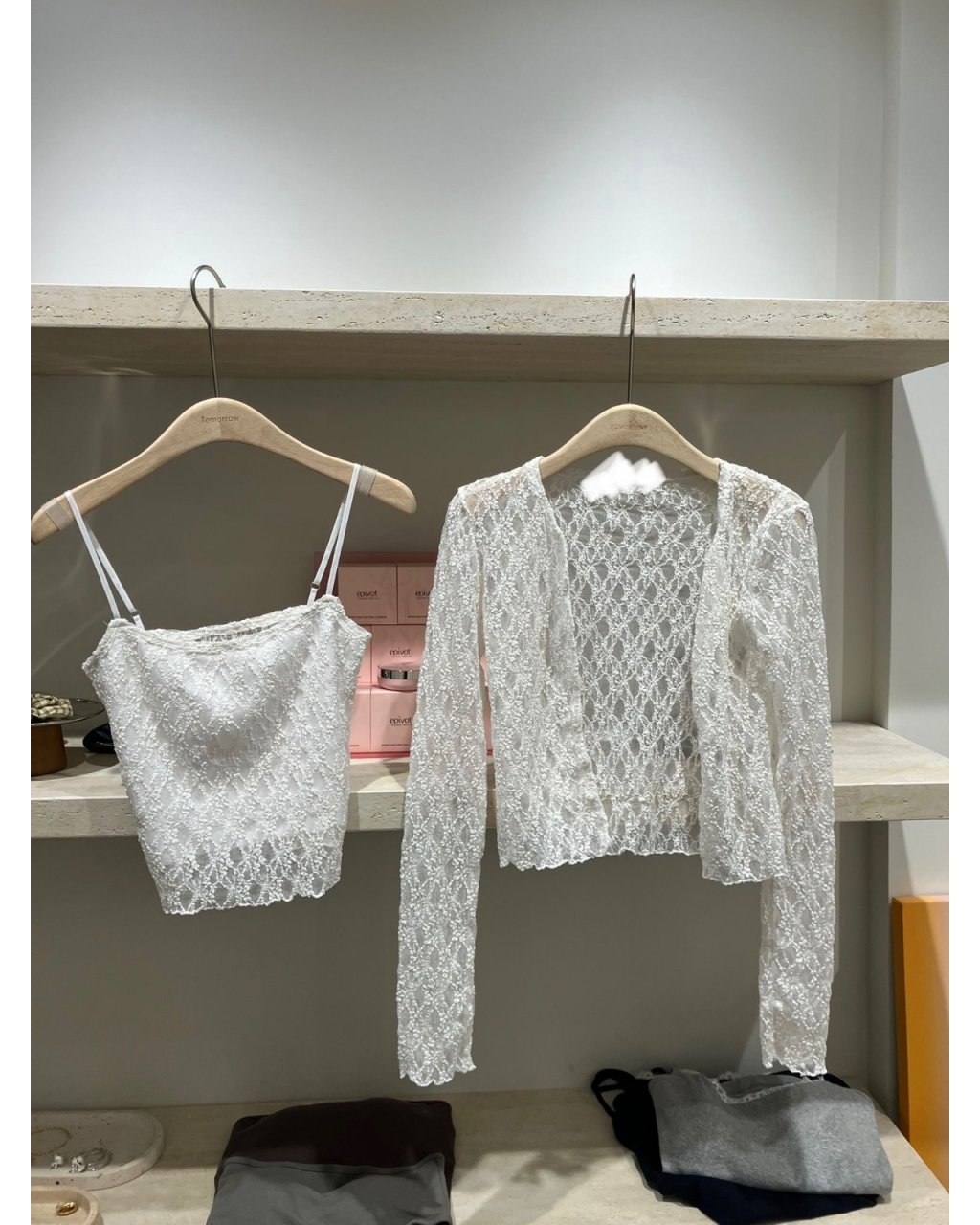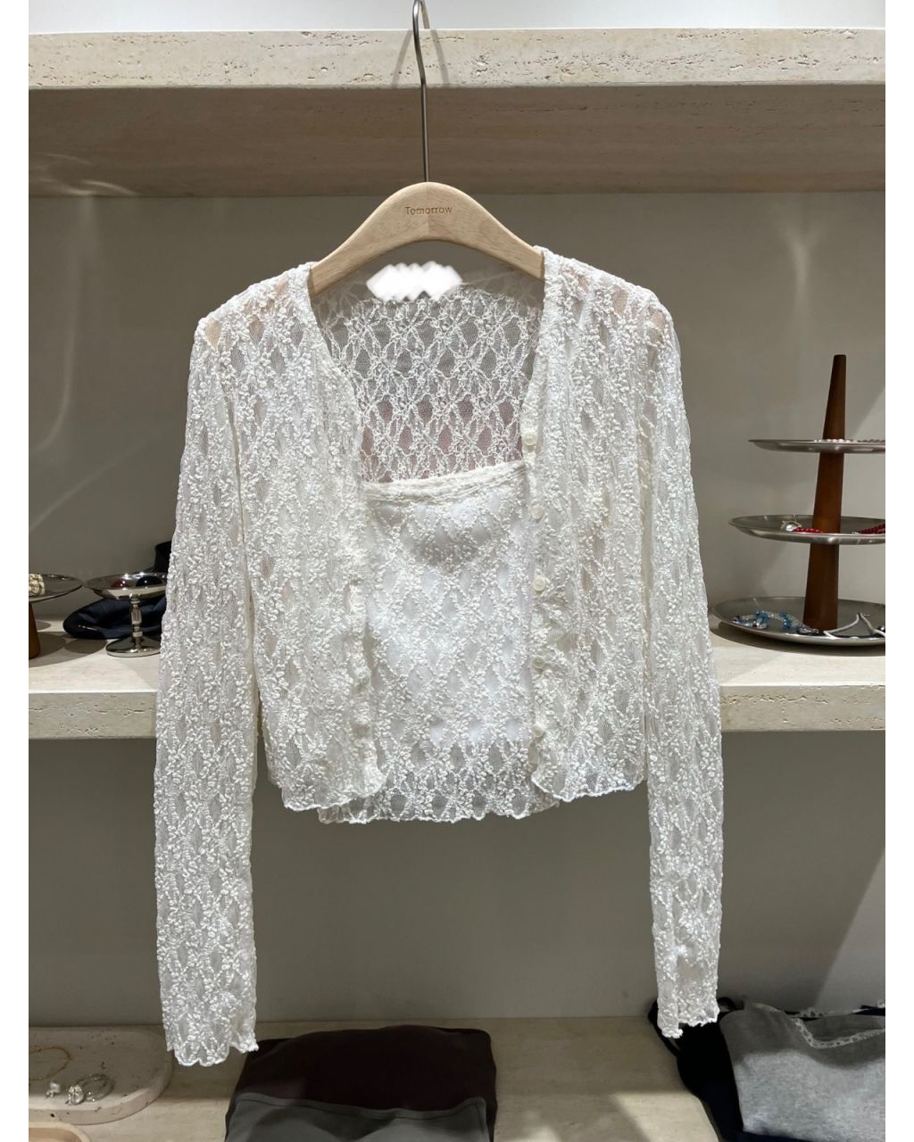 成套包括蕾絲LACE長袖小外套+同布吊帶背心,一套買返去就可以直接出門。細緻花紋LACE帶少少透膚效果,但吊帶背心已經有襯裡,唔怕太暴露;短身剪裁襯高腰牛仔褲或半身裙好顯比例,單穿背心或只着外套叠搭 tee 都得,一套有多種穿法。