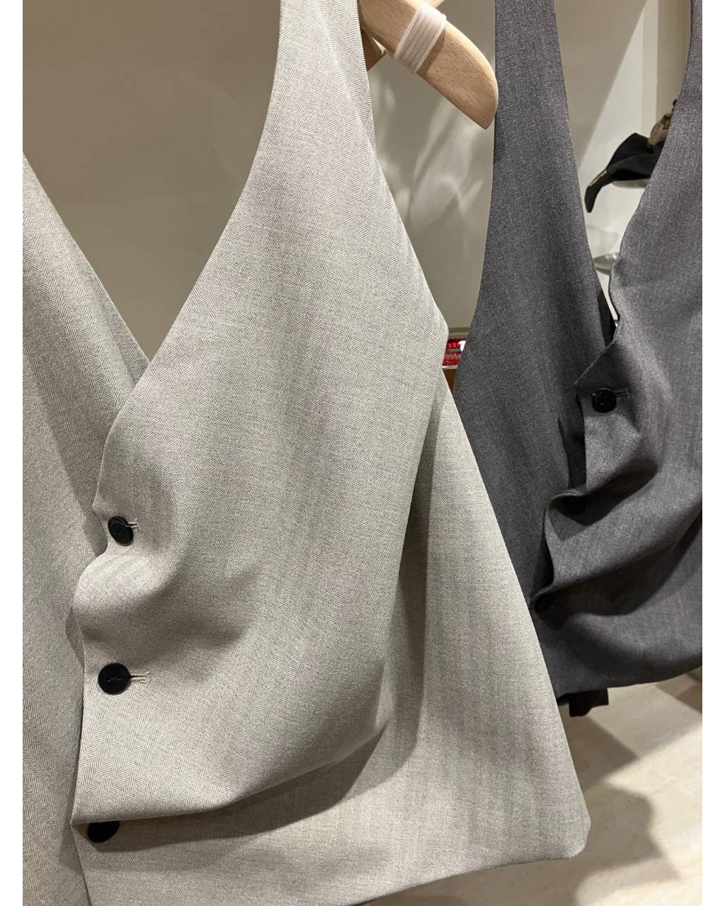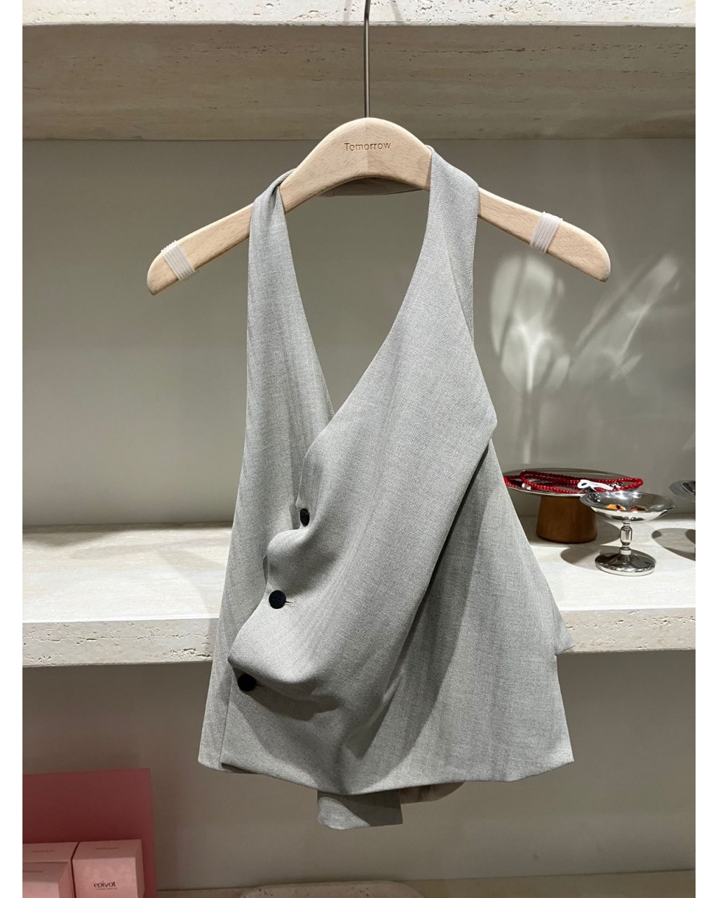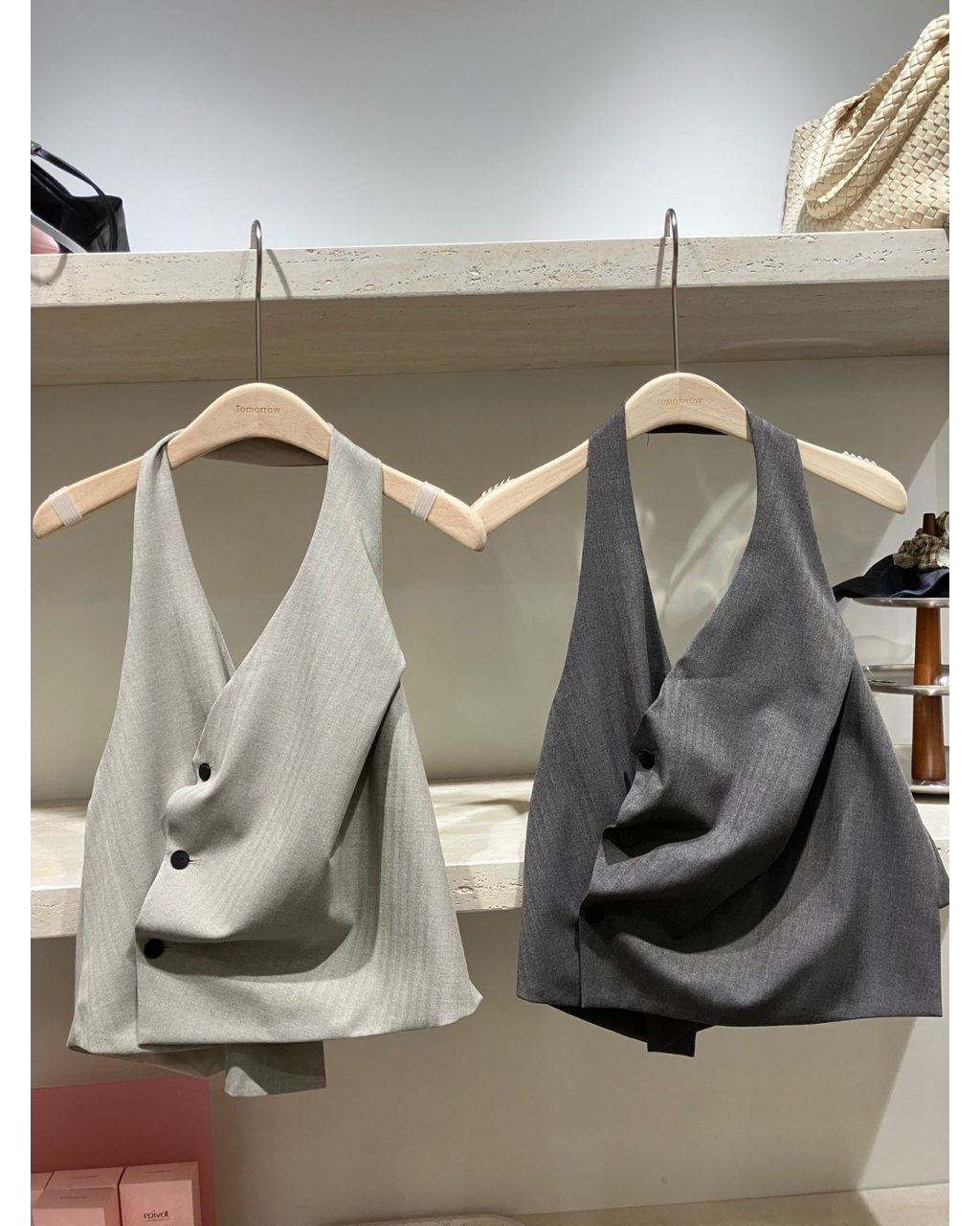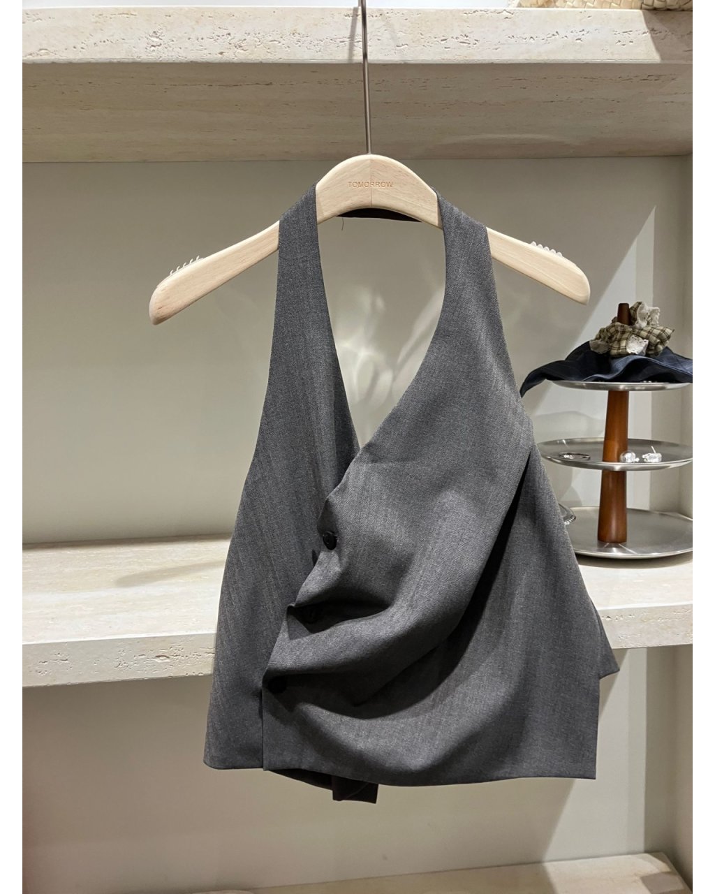 用上西裝質感布料做成不對稱掛頸剪裁,前幅有自然垂下嘅摺疊設計,好似半件西裝外套 drape 喺身上,極有設計感。